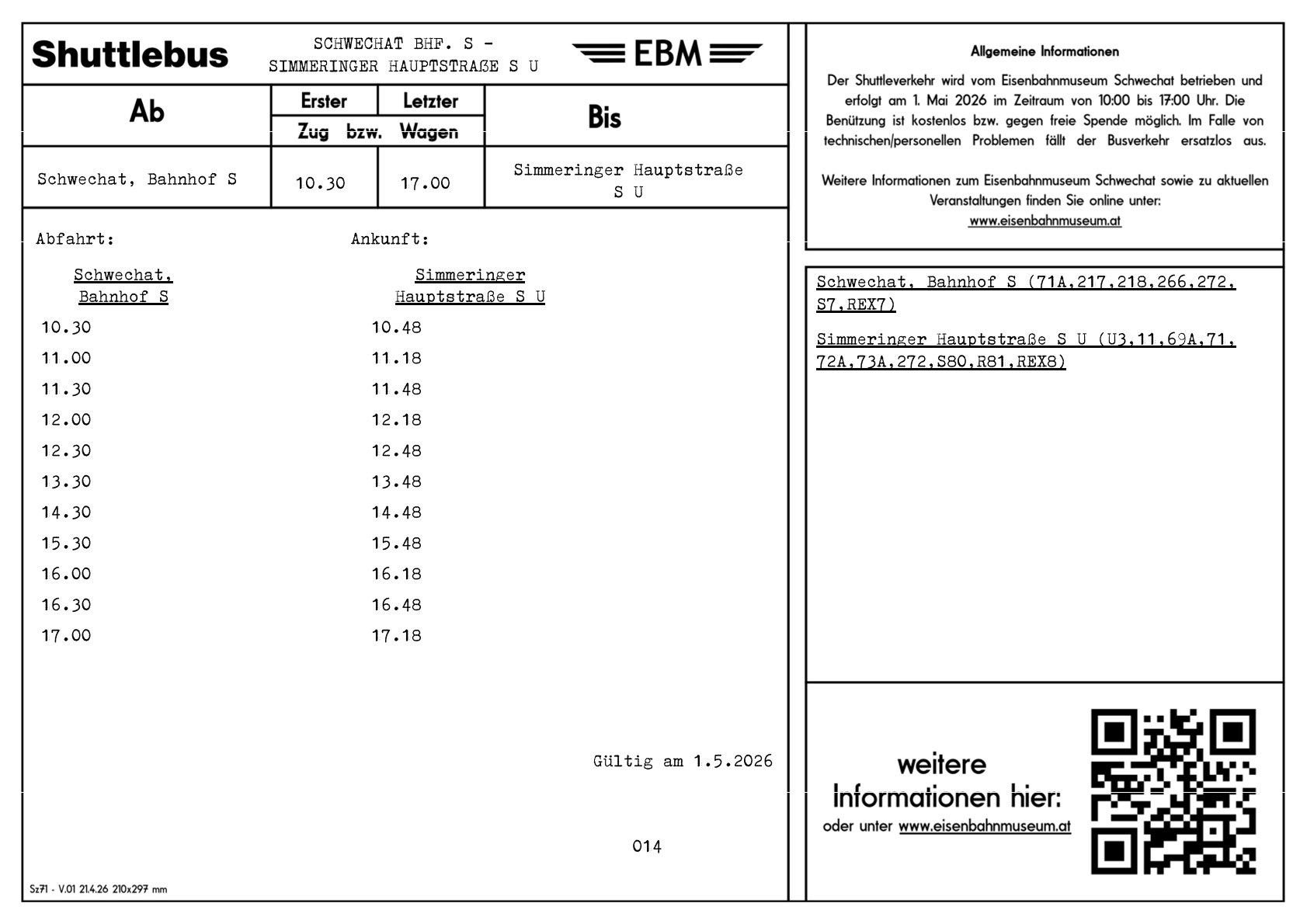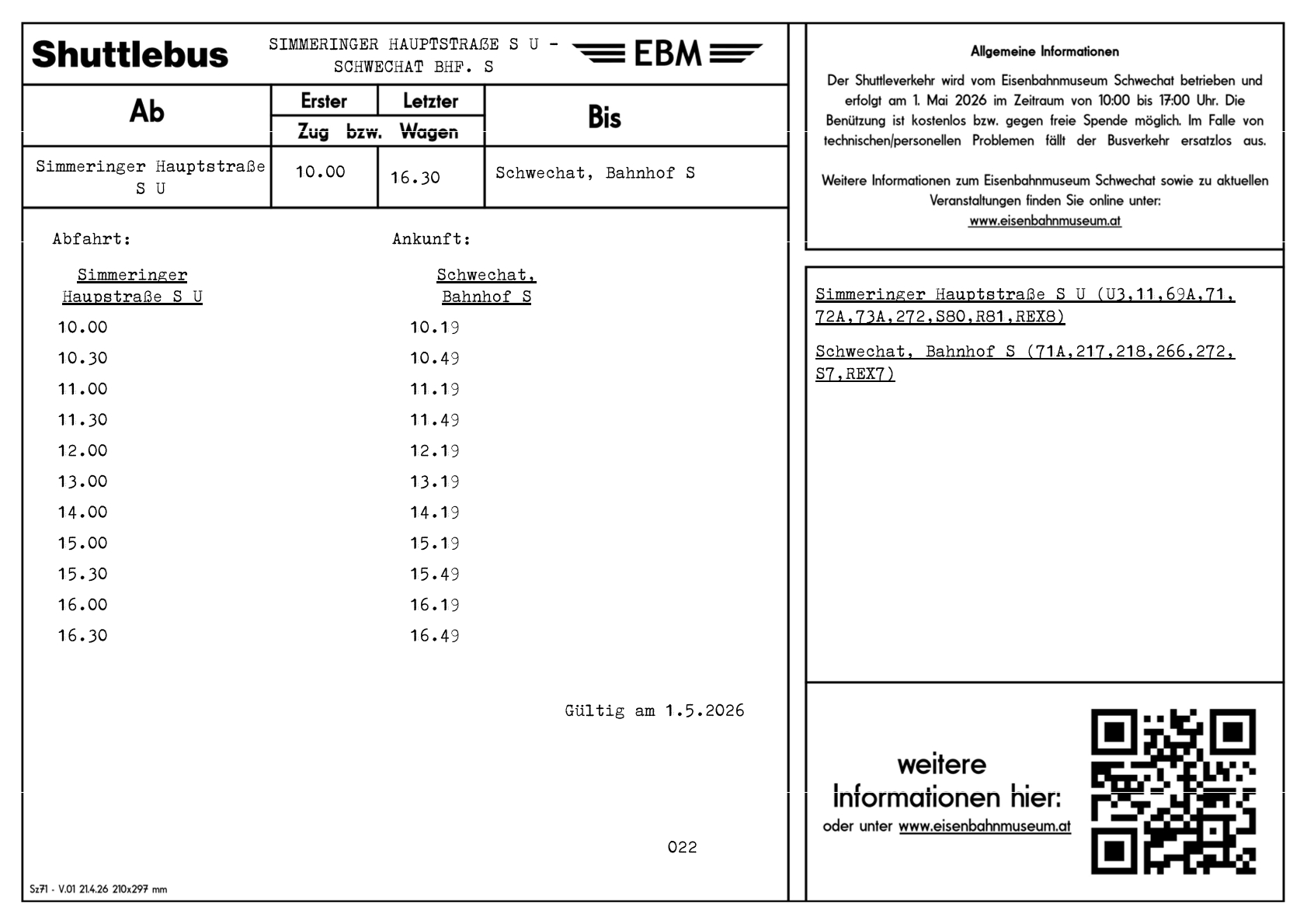 - 26. Oktober 2026 – Saisonabschluss mit historischem Shuttlebus zwischen Simmering U3 und Museum.